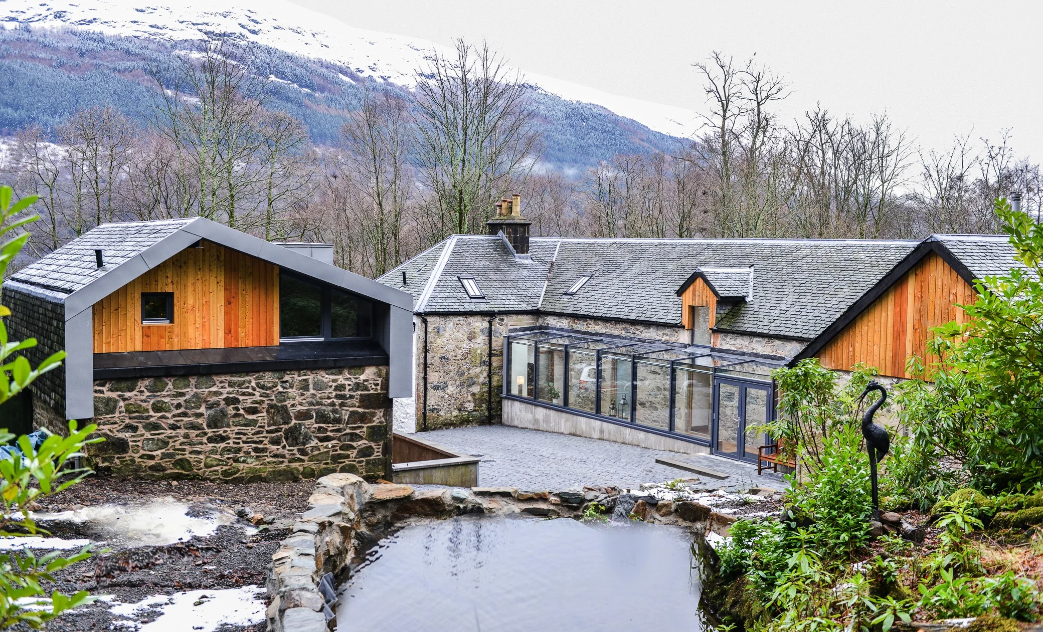 Having acquired, planning consent, listed building consent and building warrant, we built glazed extensions, renovated the existing structure and created a luxury 7 bed retreat by Ben Lomond. This is a place for people to connect with nature and family. A hot tub, integrated sound, glazed house extensions, a gem of a coach house renovation and glazed walkways focus on gathering spaces in the courtyard and walled garden. Our client has created a truly remarkable retreat. You can even book it for your family.
